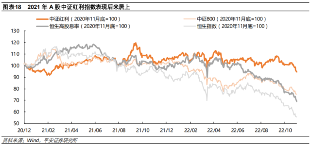 其一,2020年11-12月左右受益于全球新冠疫苗研发与接种取得积极进展提振经济恢复信心,风险资产大幅反弹,更低估值的港股高股息率指数在为期一个半月左右的反弹第一阶段涨幅高于A股红利指数11个百分点。2020年12 月 1 日-2021年1月21日大盘反弹阶段,中证800、恒生指数分别上涨10.5% 、13.6%,中证红利逆势下跌,累计跌幅为2.9%,同期恒生高股息率指数上涨8.3%,虽然跑输恒生指数5.3pct,但相比中证红利指数有11.3pct的超额收益。在此阶段,恒生高股息率指数内部领涨成分股集中在航运及港口、工业零件及器材等与全球复苏预期相关的行业。此后,在2021年1月22日-2021年5月27日大盘震荡但红利策略趋势向上的阶段, A股和港股两地的红利策略指数逐渐建立相对市场基准指数的超额优势,且A股红利指数逐渐跑赢恒生高股息率指数,此阶段中证红利指数上涨10.2%,同期中证800指数下跌 3.0%; 恒生高股息率指数上涨9.5%,恒生指数下跌2.7%。