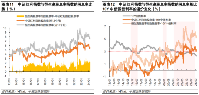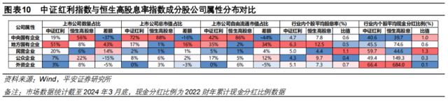 其中,央企在港股红利指数中的总市值占比为 88%,高于 A 股比重 16 个百分点。其三,以二者股息率对比来看, 2015 年以来恒生高股息指数股息率开始显著高于中证红利, 目前平均高出 4 成左右。截至 2024 年 3 月底, 中证红利指数近 12 个月股息率为 5.4%,恒生高股息率指数股息率为 7.7%,是中证红利指 数的 1.4 倍,二者之间的倍数处于滚动五年历史 88%分位。其四, 从相比国债利率的股息率溢价来看, 中证红利指数自 2018 年下半年开始相对 10Y 中债利率有稳定的正股息率溢价,并于 2022 年下半年达到历史高位 4.2pct 左右,目前中证红 利指数股息率溢价为 3.1pct,处于近 5 年 70%分位水平。恒生高股息率指数自 2014 年下半年开始相对 10Y 中债国债利率 有稳定的正股息率溢价,整体变化趋势与中证指数相近,并于 2022 年 11 月左右达到历史高位 6.9pct 附近, 目前指数股息 率溢价为 5.4pct,处于近 5 年 80%分位水平。
