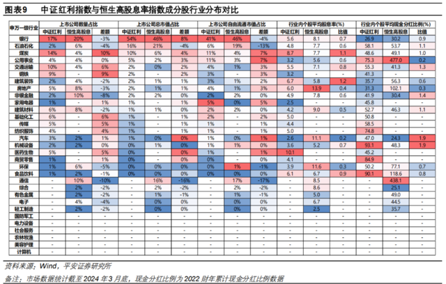 从指数基础体征来看,A 股和港股两地红利指数成分股多分布在银行业和能源业,国企市值占比均接近 90%。其一,对比 二者成分股行业分布,以上市公司总市值占比来看,中证红利成分股集中在银行、石油石化、煤炭、公用事业、交通运输 行业, CR5 为 87%,银行业总市值占比最大, 为 54%;恒生高股息成分股集中在银行、石油石化、 通信 、煤炭、公用事 业行业, CR5 为 90%,其中,石油石化、通信行业上市公司在恒生高股息指数中的市值占比分别高于中证红利指数 4 、16 个百分点。其二,以成分股公司属性分类来看,截至 2024 年 3 月底,从上市公司总市值占比来看,全部国有企业在中证 红利和恒生高股息率指数中的市值占比均达到 89%。