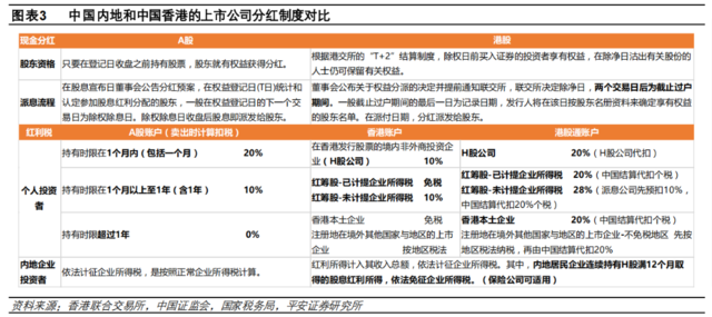 第三,股息所得税收成本方面, A股持股一年以上为零税率,港股通个人投资者综合税率为20%-28%, 港股通内地居民企业投资者2持有H股满12个月免征企业所得税。对于A股投资,红利所得的扣税环节在最终卖出股票时,根据持股时长计算税率成本,以1个月以内、1个月以上至1年、 1年以上时间间隔划分,分别对应20% 、10% 、0%的征税比率。对于港股投资,红利扣税对于所有持股期限的投资者均设有固定的税率,其中,内地个人投资者通过港股通账户投资港股的,一般需按20%税率征收个人所得税,特别地,若红筹股上市公司在未计提企业所得税情况下分红派息,个人投资者的红利所得综合税率为28%。