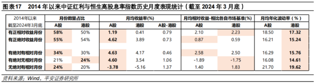 从月度表现来看,2014年以来有A股和港股的红利指数有正收益的月份数基本接近,占比约54%-55%,A股月度收益均值略微高于港股0.7pct左右,月均年化波动率略微高于港股1pct。在2014年1月-2024年3月区间的123个月里,A股、港股红利指数有正收益的月份数量占比分别为55%、54%,月均收益率分别为4.6%、3.9%,月均年化波动率分别为16.2%、15.2%;同期既有正绝对收益又有正相对收益的月份数量占比分别为34%、30%,月均收益率分别为4.63%、4.17%,相对各自市场基准指数的月均超额收益率分别为2.58%、2.50%,月均年化波动率分别为16.3%、15.8%。