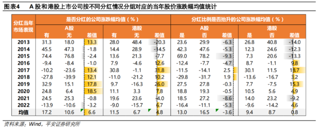 如果考虑市场提前博弈,分别统计每年分红比例是否抬升公司在分红当年的涨跌幅, 2013-2022 年这十年间,A 股分红比例抬升公司在分红当年涨跌幅平均低于分红比例未抬升公司3.6个百分点,同期港股分红比例抬升公司涨跌幅平均高于未抬升公司0.8个百分点;其中,A 股仅有 2017 年和 2018 年这 2 年分红比例抬升公司有超额收益,幅度平均为2.2个百分点;港股在2016-2020年间以及2022年分红比例抬升公司均有超额收益,超额幅度均值为9.4个百分点。