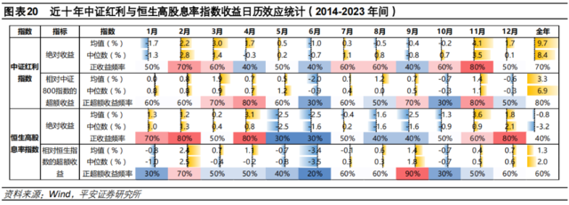 阶段性来看,一般在港股市场反转初期,港股高股息指数会跑赢A股红利指数,但并未跑赢恒生指数。此阶段平均持续1-3个月左右,恒生高股息率指数收益平均高于中证红利15-25pct,低于恒生指数5-12pct。从日历效应看,高股息策略在部分月份胜率有所提升,年末往往表现较好。2014-2023年间, A股红利指数较好的月份在3月和11月,胜率平均在60%-80%,月度收益率均值约3%-4%;港股表现较好的月份在2月、4月和11-12月,正收益胜率平均在60%-80%,月度收益率均值约1%-4%。