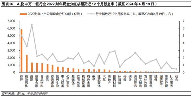 从政策端来看,2024年4月12日,国务院发布资本市场新“国九条”,即《关于加强监管防范风险推动资本市场高质量发 展的若干意见》。其中,在强化上市公司现金分红监管方面,加大鼓励上市公司分红, 将分红与ST挂钩,多措并举提高股息率;增强分红稳定性、持续性和可预期性,推动一年多次分红、预分红、春节前分红。根据沪深北交易所的细则规定,对于主板公司,如果最近一个会计年度净利润和母公司报表未分配利润均为正, 最近三个会计年度累计现金分红总额低于最近三个会计年度年均净利润的30%,并且最近三个会计年度累计分红金额低于5000万元,将被实施ST,对于创业板和科创板公司,考虑到不同板块特点和公司差异情况,将分红金额绝对值标准调整为3000万。