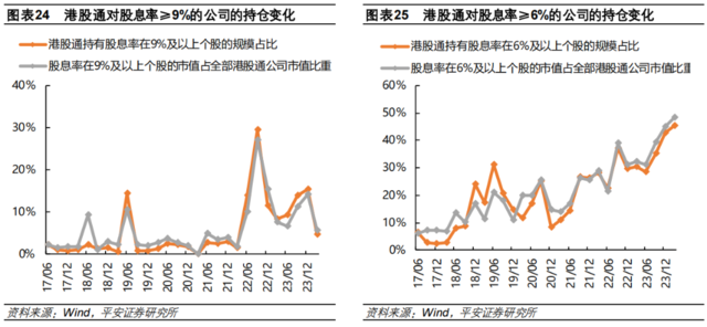 在港股市场,港股通资金对于高股息个股暂无明显超配迹象。截至2024年3月底,股息率在9%及以上的个股持仓约4.8%,略低于相应公司总市值占比5.6%的水平; 股息率在6%及以上的个股持仓占比约45.5%,相应上市公司总市值占比为48.5%。