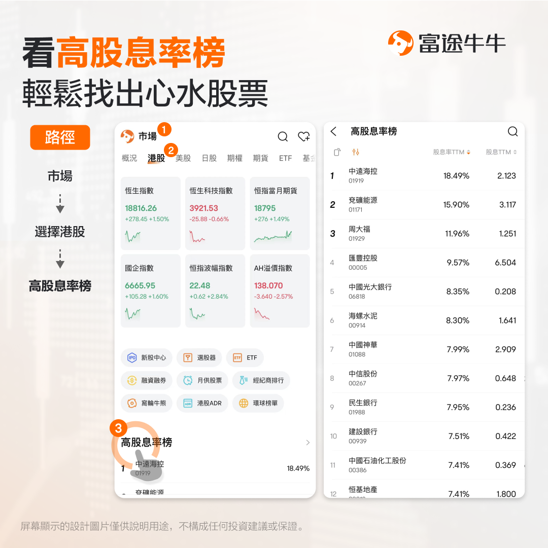 牛友们可以通过发现 > 市场 > 选择港股 > 高股息率榜,轻松找出心水股票。