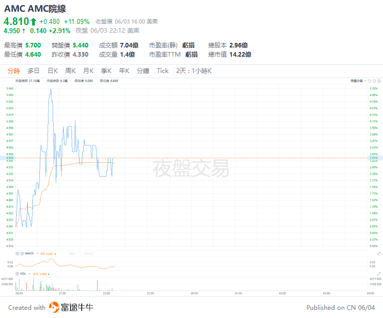 另一Meme股$AMC院线 (AMC.US)$盘初一度涨超28%,收涨11.09%,报4.81美元/股,总市值14.22亿美元。AMC院线美股夜盘涨幅回落,截至发稿涨2.91%。