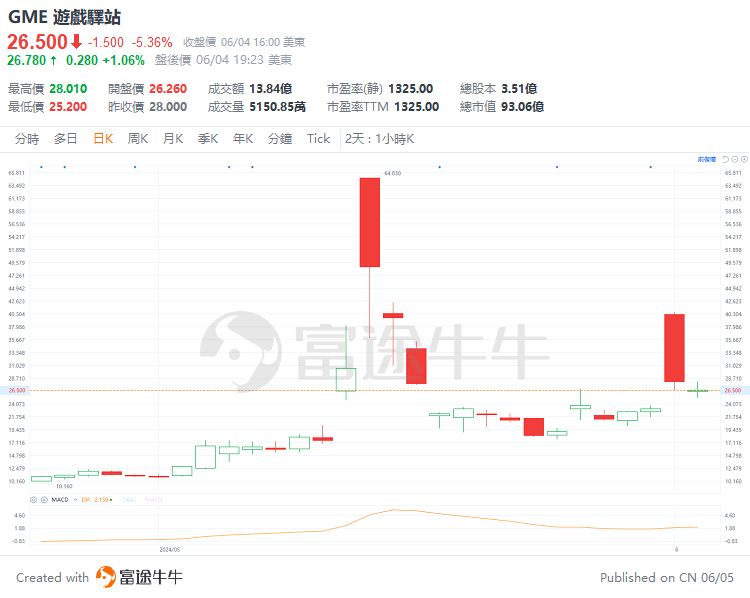 周二,游戏驿站的股价下跌了5.36%,报26.5美元。