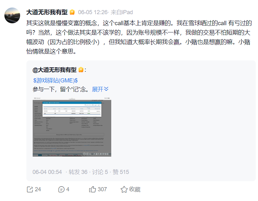 段永平也凑热闹,卖出行权价高达100美元的游戏驿站看涨期权,期权的截止日期为2025年1月17日。段永平操作后又补充发帖表示,这个call基本上肯定是赚的。