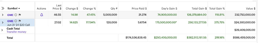 截至周四收盘,带头大哥持有的GME股票和期权合约价值已达到惊人的 5.57 亿美元,浮盈达到3.8亿。
