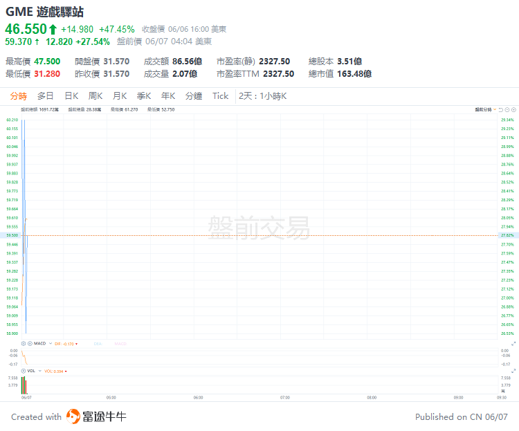 GME周四盘中飙涨50%,最终收涨超47%,收报46.55美元,全日成交明显放量。周五美股盘前,截至发稿,游戏驿站涨近30%。