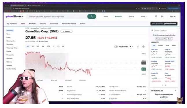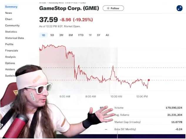 在他直播之前,号称是其唯一股票持仓的游戏驿站(GME)下跌32.05%至31.63美元,因跌幅过大而一度暂停交易。直播过程中,该股不断下跌且多次熔断,50分钟直播结束时跌超40%。