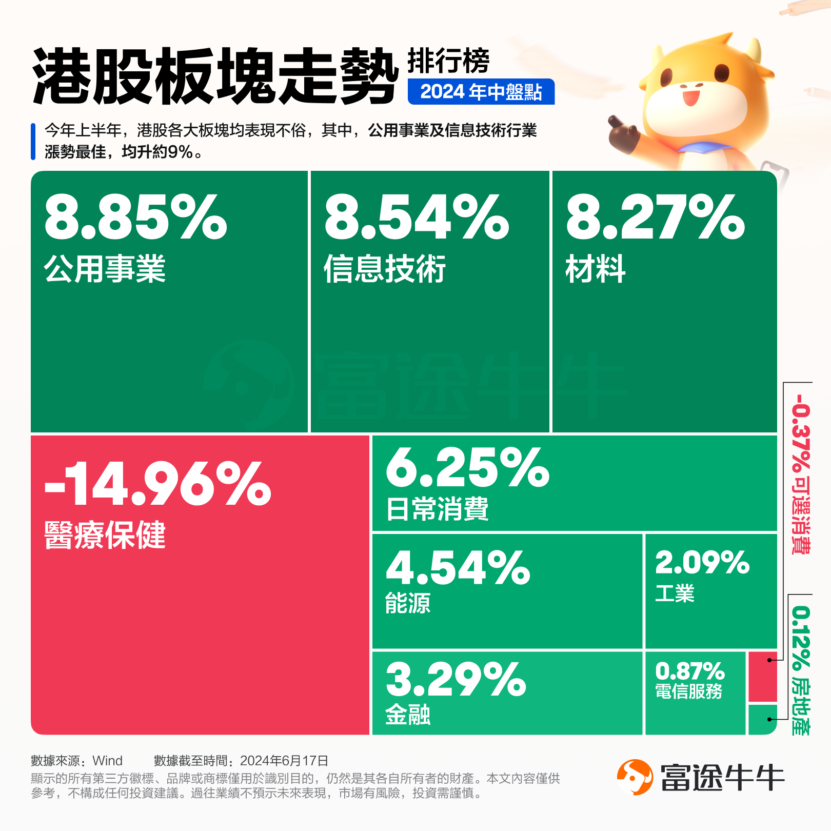 随着时间来到6月份,港股市场今年来各板块的表现也逐渐清晰。在众多板块中,公用事业和科技板块凭借其优异的表现脱颖而出。截至6月17日收盘,公用事业板块累涨8.85%,信息技术板块涨8.54%。