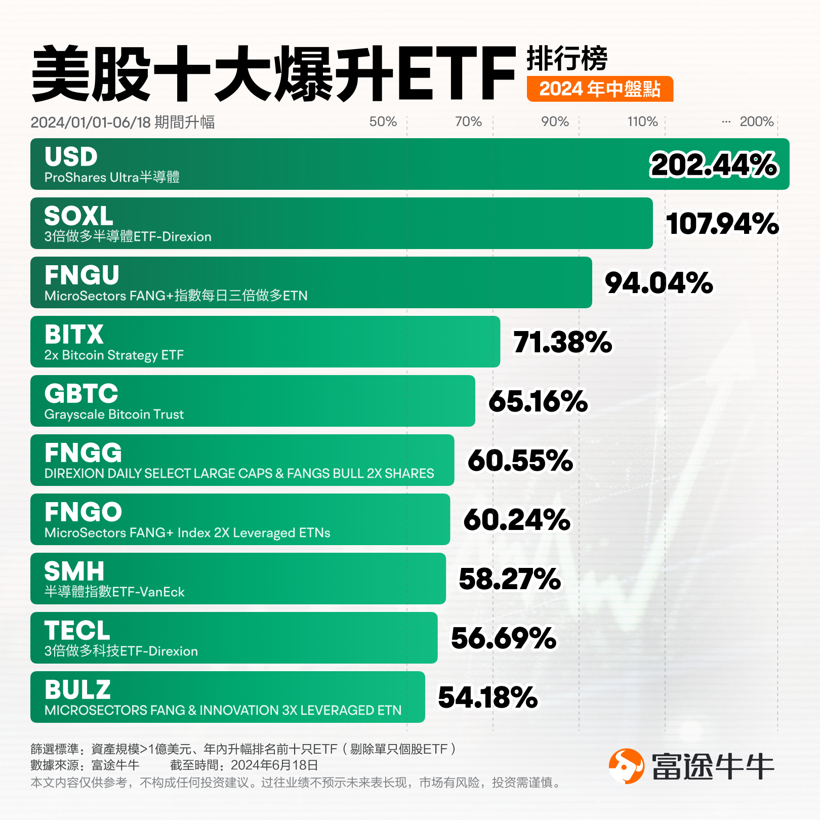 今年上半年,随着全球资金争相布局AI,科技板块势不可挡,推动美股迎来一次次的新高。在这当中,美股各类交易所指数基金(ETF)也看点满满,这些ETF不仅追踪各指数、行业板块的表现,也有不同的杠杆倍数供投资者选择,赚钱能力与吸金规模均十分强劲,受到了市场的关注和热捧。
