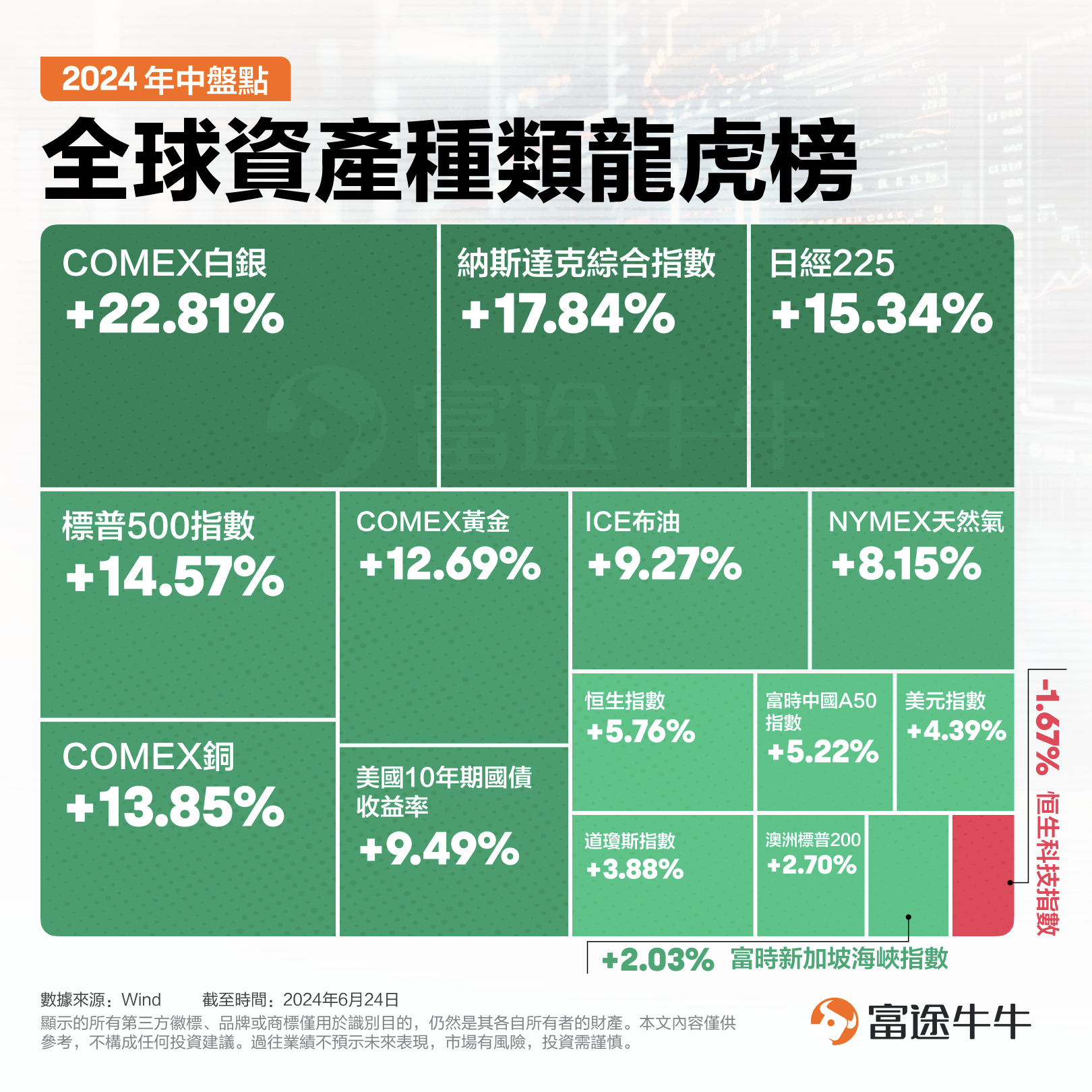 2024年上半年,世界局势风起云涌,热点事件层出不穷,投资者也见证了一个又一个“历史性事件”。大类资产中,以“AI概念”和“七巨头”为支撑的美股持续去年以来的强势,屡创新高;而市场热点又不断轮动,从日股、黄金、铜到白银,再到港股,投资者“心水”的对象不断变化。