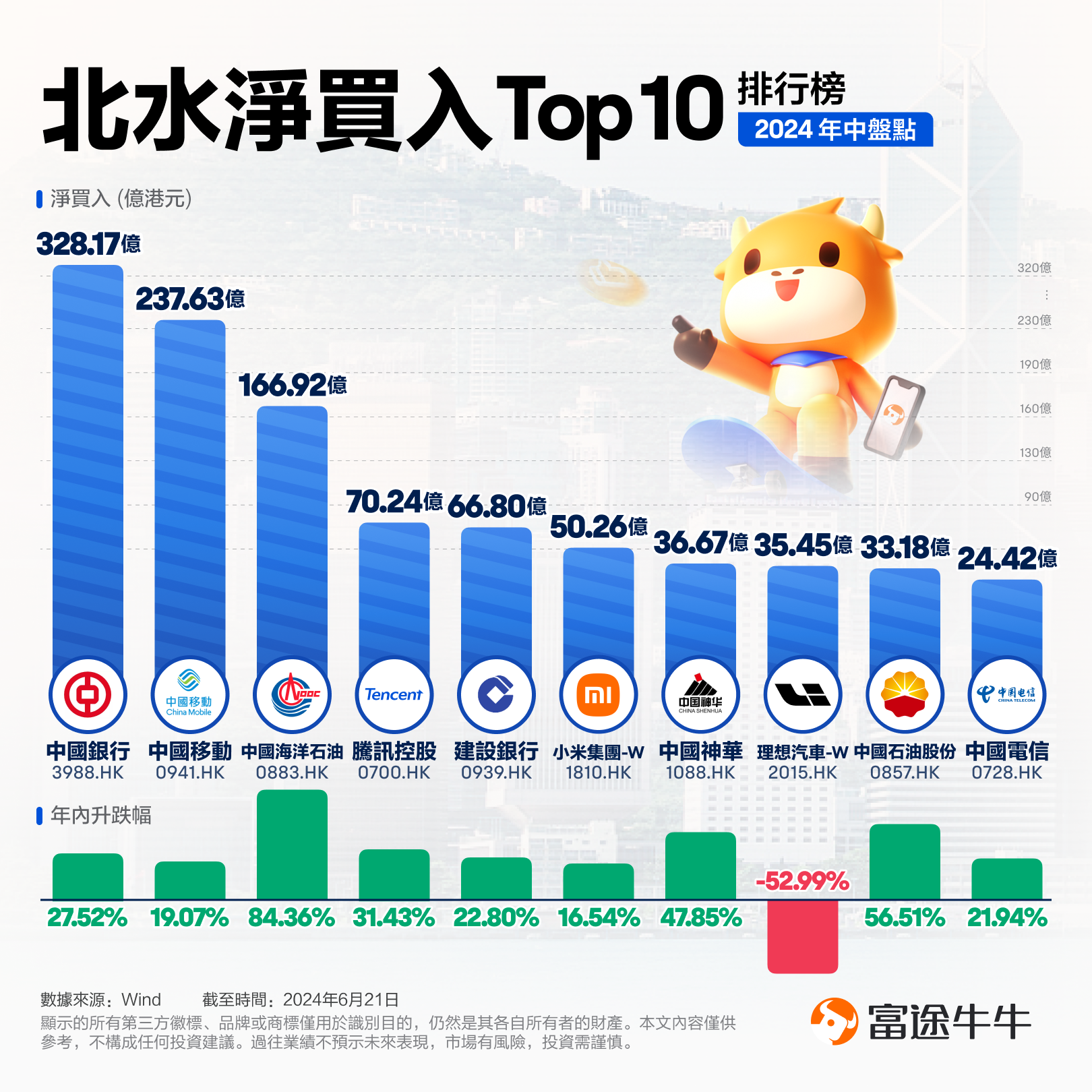 从南向资金今年主要流入个股来看,“中字头”、高股息仍是最受北水追捧的加仓对象。$中国银行 (03988.HK)$、$中国移动 (00941.HK)$、$中国海洋石油 (00883.HK)$获加仓金额分别超过328亿港元、237亿港元与166亿港元,位居全市场北水资金流入的前三名;此外,$中国神华 (01088.HK)$、$中国石油股份 (00857.HK)$、$中国电信 (00728.HK)$均获得北水大额流入。