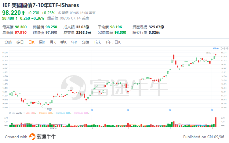 3、 $美国国债7-10年ETF-iShares (IEF.US)$ :该ETF是追踪中期美国国债指数的ETF,投资于剩余年期在7至10年的美国政府债券。相对于TLT这类长期国债ETF,IEF受利率变动影响的程度适中,既有一定的收益提升空间,又能在一定程度上抵抗利率风险。