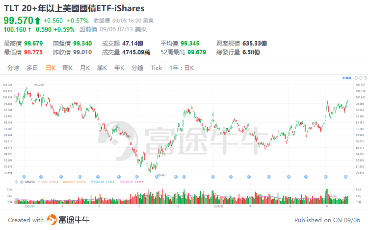 受昨日ADP数据不及预期的影响,美债ETF再度上涨,其中 $20+年以上美国国债ETF-iShares (TLT.US)$ 盘中一度创下2023年五月中旬以来新高。