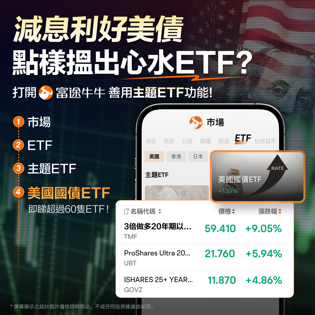 減息利好美債,點樣搵出心水ETF?打開牛牛App善用主題ETF功能!市場>ETF>主題ETF>美國國債ETF,即睇超過60隻ETF!