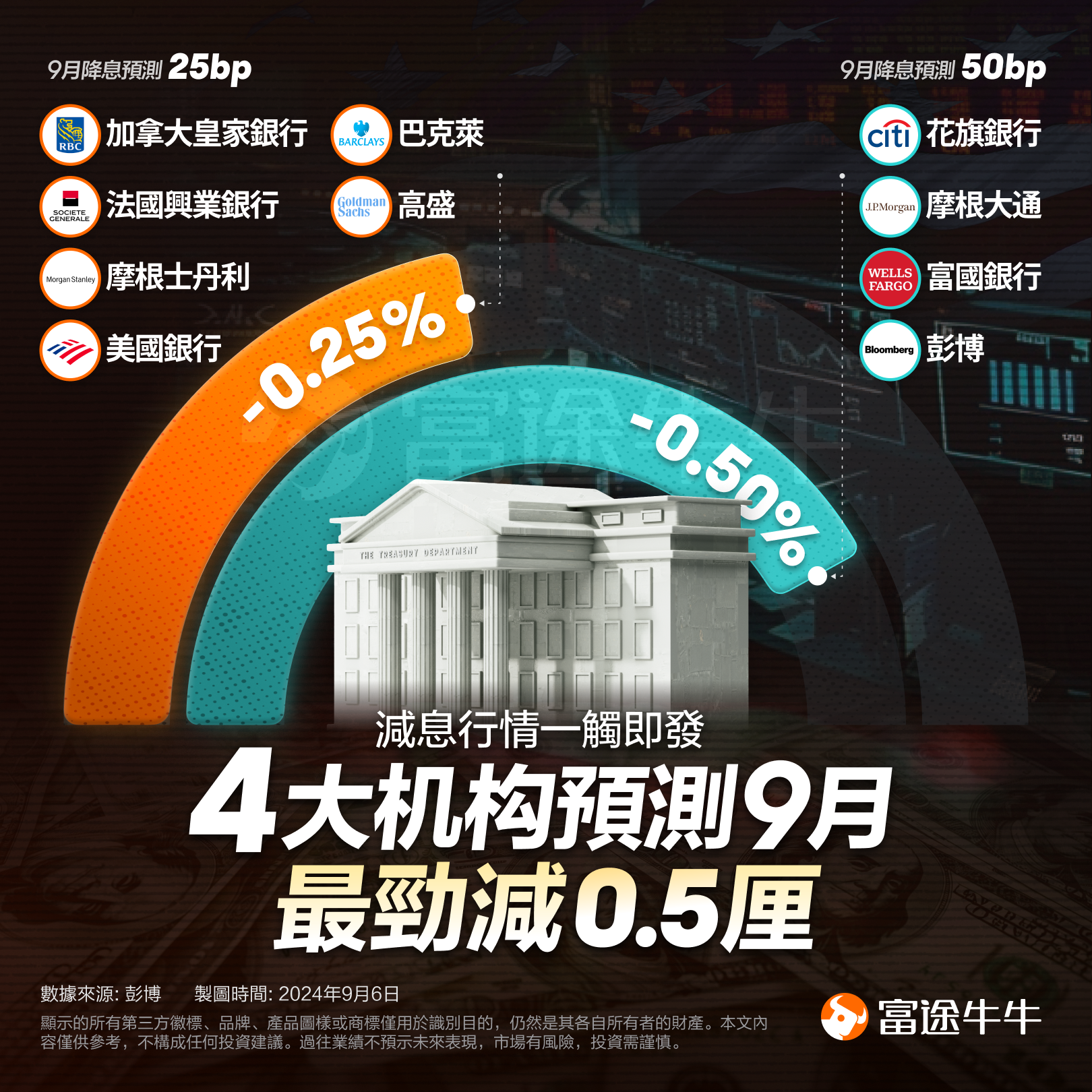 目前摩根大通、花旗等四家机构均预计美联储9月降息50个基点。