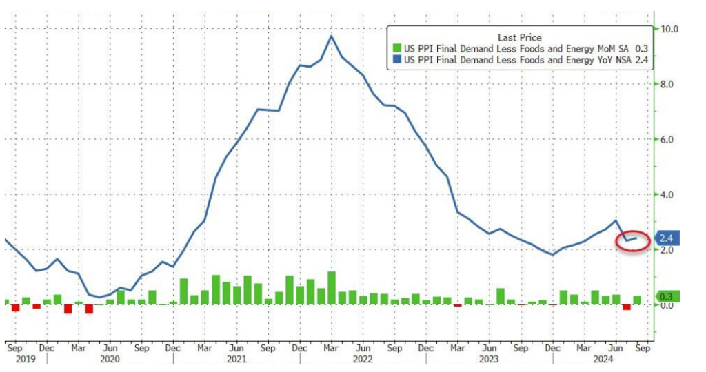 剔除食品、能源和贸易服务后,8月核心PPI同比增2.4%,符合预期,高于前值2.3%;环比增0.3%,高于预期0.2%。