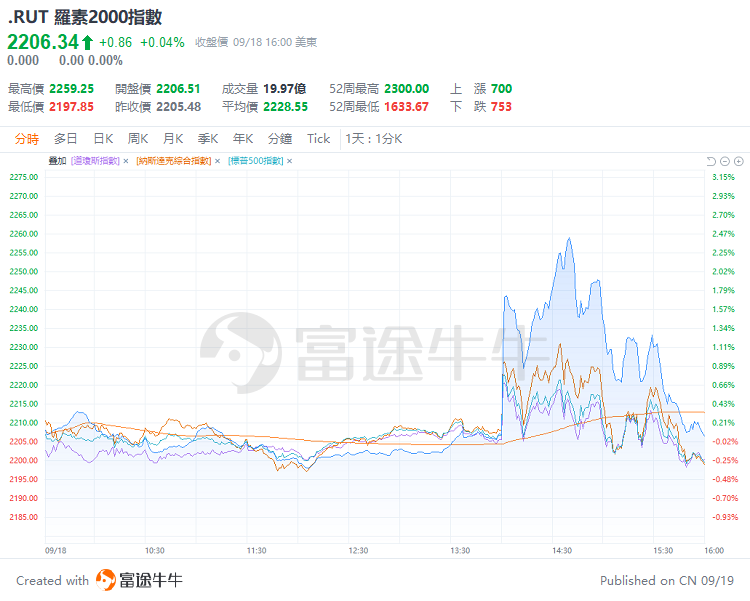 另一边,代表小盘股的 $罗素2000指数 (.RUT.US)$ 表现稍微优于三大指数。在美联储宣布降息50个基点后,罗素2000指数一同直线拉升,且弹性更大,最终平收。实际上,截止9月18日收盘,罗素2000指数已连升6日。