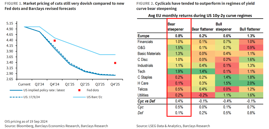 巴克莱指出,首次降息50基点凸显了美联储实现经济软着陆的决心,只要有更多数据支持美国经济反弹,周期股很可能会稳步反弹,关注本周公布的美国9月PMI和即将到来的三季度财报季。