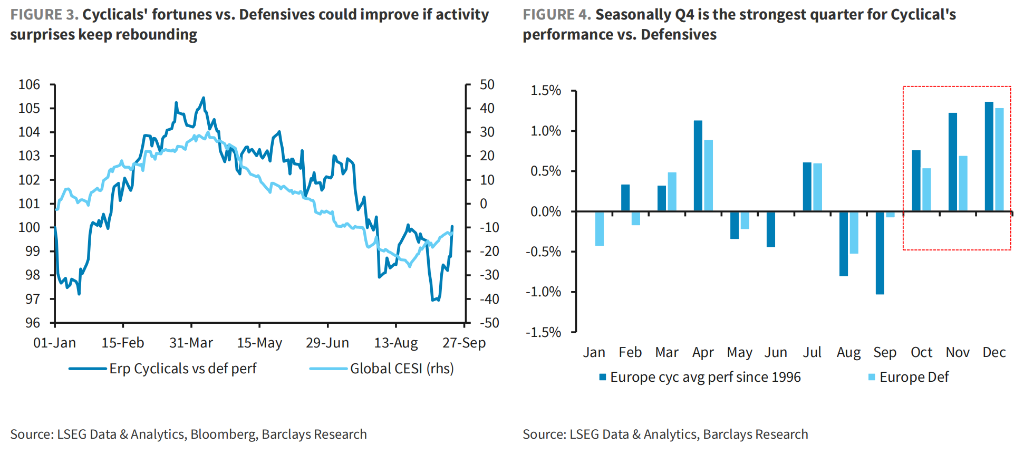 周期股之前超卖并且基本面被低估,其估值对于投资者而言仍具吸引力。且在历史上,四季度通常是美股表现最佳的时期,周期性股票往往优于防御性股票。此外,由于夏季以来股市的防御性定位,周期性股票的反弹可能会让许多投资者感到意外。