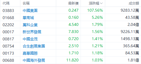 值得注意的是,今日部分地产股仍延续近期升势,其中 $中国奥园 (03883.HK)$ 一日飙升超107%, $华南城 (01668.HK)$ 涨超5%。