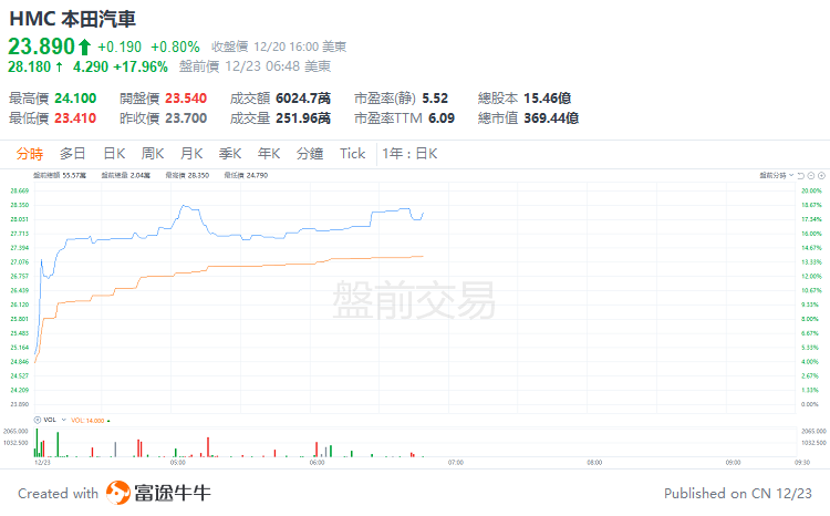 日本当地媒体上周率先报道了这项拟议中的交易,在相关报道发布后,日产汽车的股价直线飙升。而周一下午宣布开启正式合并谈判后,本田美股盘前现上涨近18%。