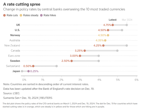 随着全球各大央行逐一开启降息周期,放松政策无疑将在2025年继续成为主旋律。然而,除了通胀和经济问题之外,地缘政治,尤其是美国候任总统特朗普的潜在政策,已经成为了各大央行在制定政策货币时无法避免的话题。