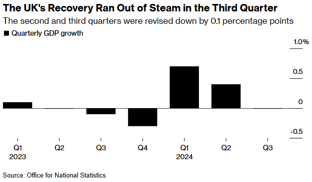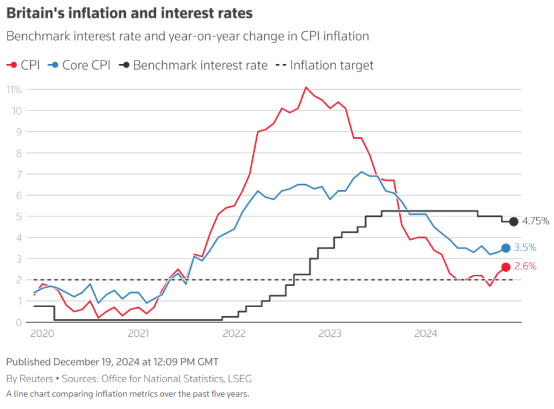 不过,经济学家的预期更为乐观,预计英国央行明年将降息四次,理由是英国经济的疲弱。该国经济一度在9月和10月出现萎缩,这是自新冠疫情以来的首次连续萎缩,并且,第三季度经济增长也陷入了停滞,主要原因是新政府宣布对企业雇主增税250亿英镑(310亿美元)。