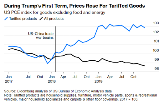 牛津经济研究院的研究显示应该谨慎对待这种类比。受关税影响的产品确实出现了明显更高的通胀: