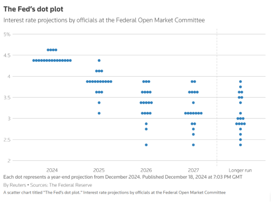 美联储对特朗普新政府执政第一年的通胀预期从此前的2.1%跃升至目前的2.5%。预计直到2027年,通胀才会回到2%的目标水平,这意味着降息的速度会放缓,利率的终点也会略高,为3.1%,将在2027年达到,而9月预期的终端利率是2.9%。长期联邦基金利率预期上升至3.0%。