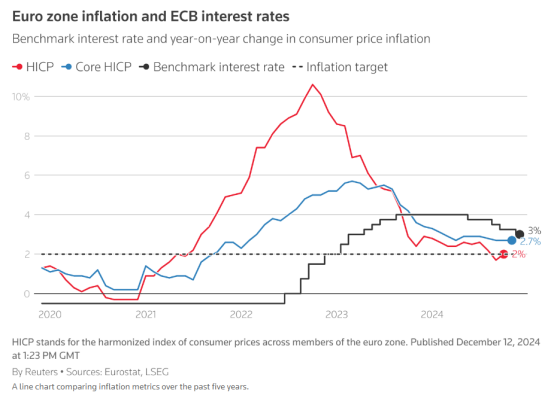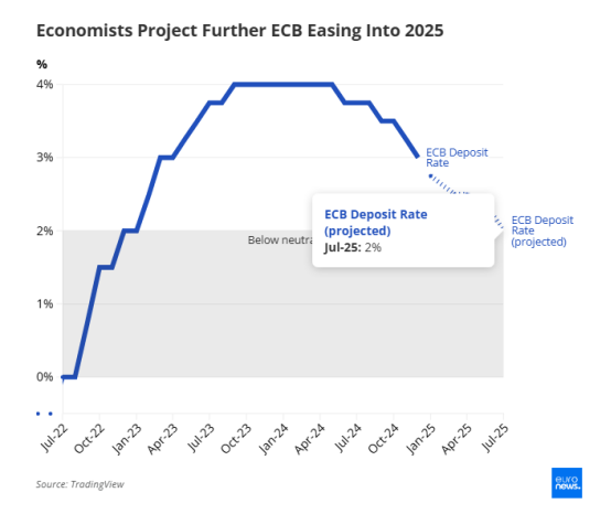 有分析称,考虑到德国经济疲弱、法国政坛动荡以及特朗普重返白宫可能带来的贸易冲击,预计在2025年中期之前,欧洲央行将在每次议息会议上继续降息。