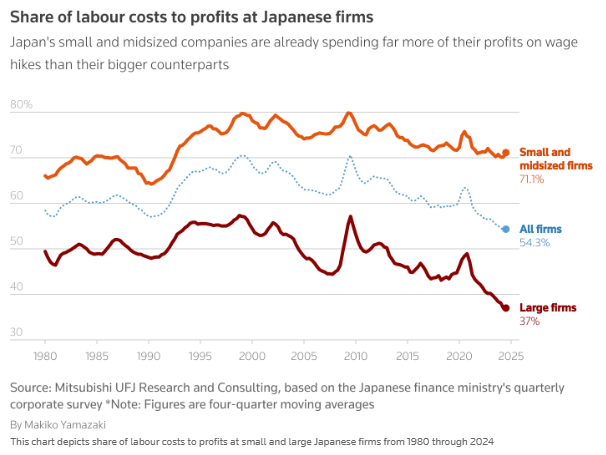 根据日本财务省上周发布的7月至9月企业调查的估计,中小企业已经将约70%的利润用于工资成本,远高于大企业的约40%。