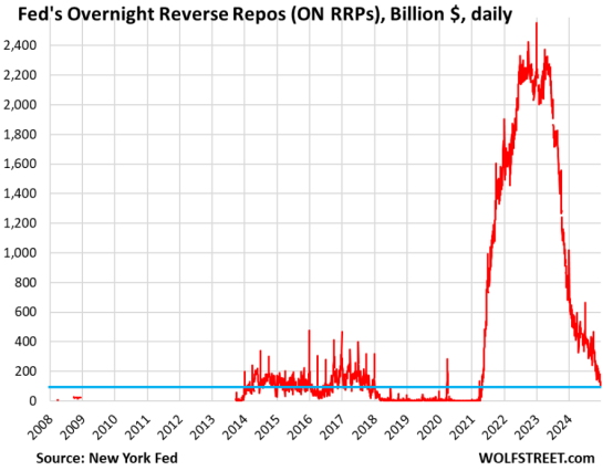 作为量化紧缩(QT)的一部分,美联储现在已经从市场中抽走了2.1万亿美元的流动性,并且基本上所有的抽水都来自于ON RRP,而不是准备金。