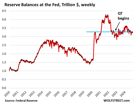 目前准备金利率(IOR)为4.40%,准备金规模达到3.28万亿美元,仍处于美联储于2022年夏季启动QT时的水平。就准备金而言,QT甚至还没有开始,在达到美联储目标的“充足”水平之前可能仍有一段路要走。