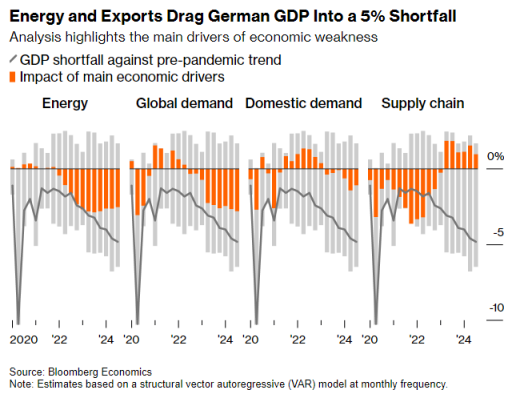 事实上,受困货币政策紧缩、俄乌冲突引发的能源危机,欧元区经济已经在2023年显示出疲软的迹象。尽管欧元区20国GDP增速在今年有所回升,但两大经济体法国和德国复苏依然乏力。其中,在经历了五年的停滞之后,德国现在的经济规模比疫情前的增长趋势要小5%。