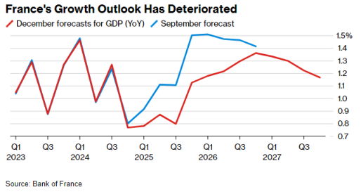 就在法国总统马克龙任命该国一年内第四任总理几天后,法国央行下调了国内增长预期,称政治动荡拖累了家庭和企业信心。