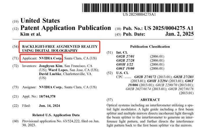 日前, $英伟达 (NVDA.US)$ 在美国专利及商标局官网公开了一项名为“无背光增强现实数字全息技术”的AR眼镜专利(专利号US20250004275A1)。