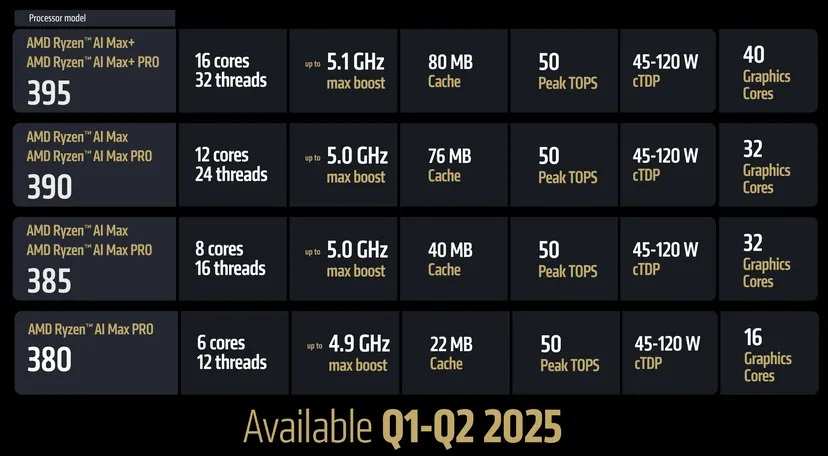 下图可见AMD计划2025年一季度和二季度内推出的锐龙 AI Max和AI Max Pro系列芯片及相关配置参数。