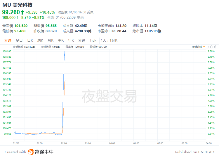 英伟达CEO黄仁勋表示美光为新的GPU提供内存。 $美光科技 (MU.US)$ 美股夜盘短线拉升,现涨近9%。