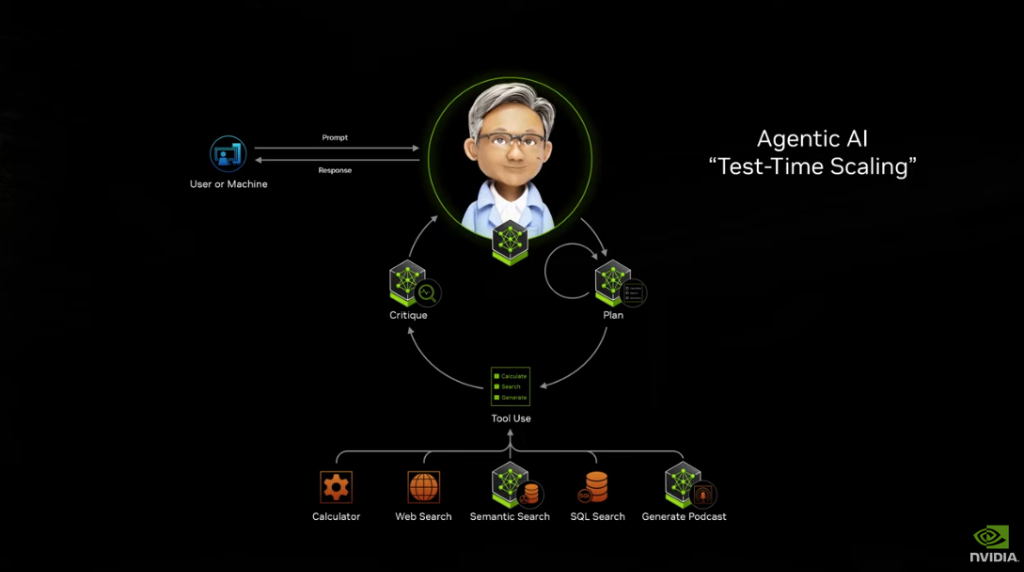 黄仁勋推出具有“测试时间缩放(Teat-Time Scaling)”功能的Agentic AI,支持计算器、网络搜索、语义搜索、SQL搜索等工具,甚至可以生成播客。