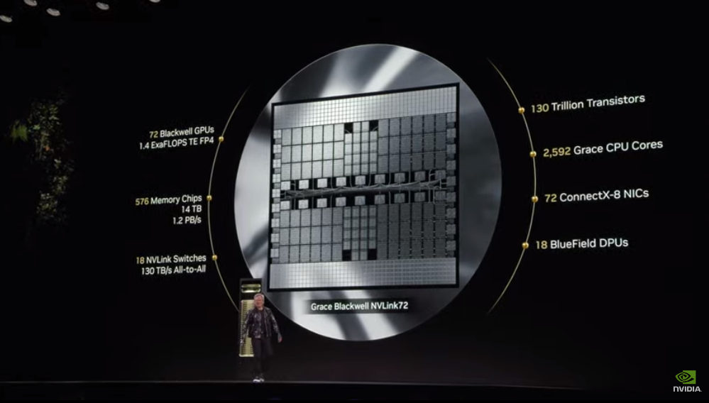 推出Blackwell架构最新的关键互联技术NVLink72。晶体管数量达到130万亿,72个Blackwell GPU具备1.4 ExaFLOPS TE FP4计算能力,拥有2592个Grace CPU核心。