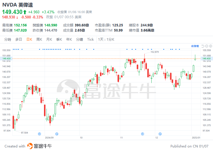 英伟达的股票周一收盘价创历史新高,达到149.43美元,使其市值达到3.66万亿美元,成为全球第二大市值上市公司,仅次于 $苹果 (AAPL.US)$ 。投资者希望黄仁勋最新的演讲能够带动股价再次实现突破。