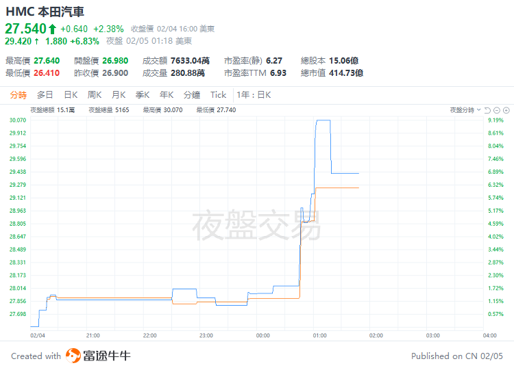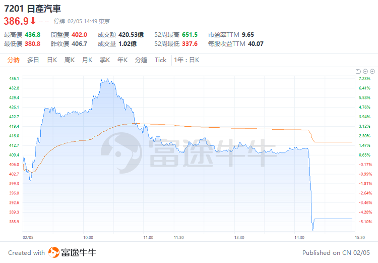 受合并谈判结束的报道影响,本田和日产的股价周三一度双双上涨,但日产随后由涨转跌。截至发稿,本田汽车美股夜盘涨近7%,而日产汽车日股股价一度跌超5%,后被交易所停牌。