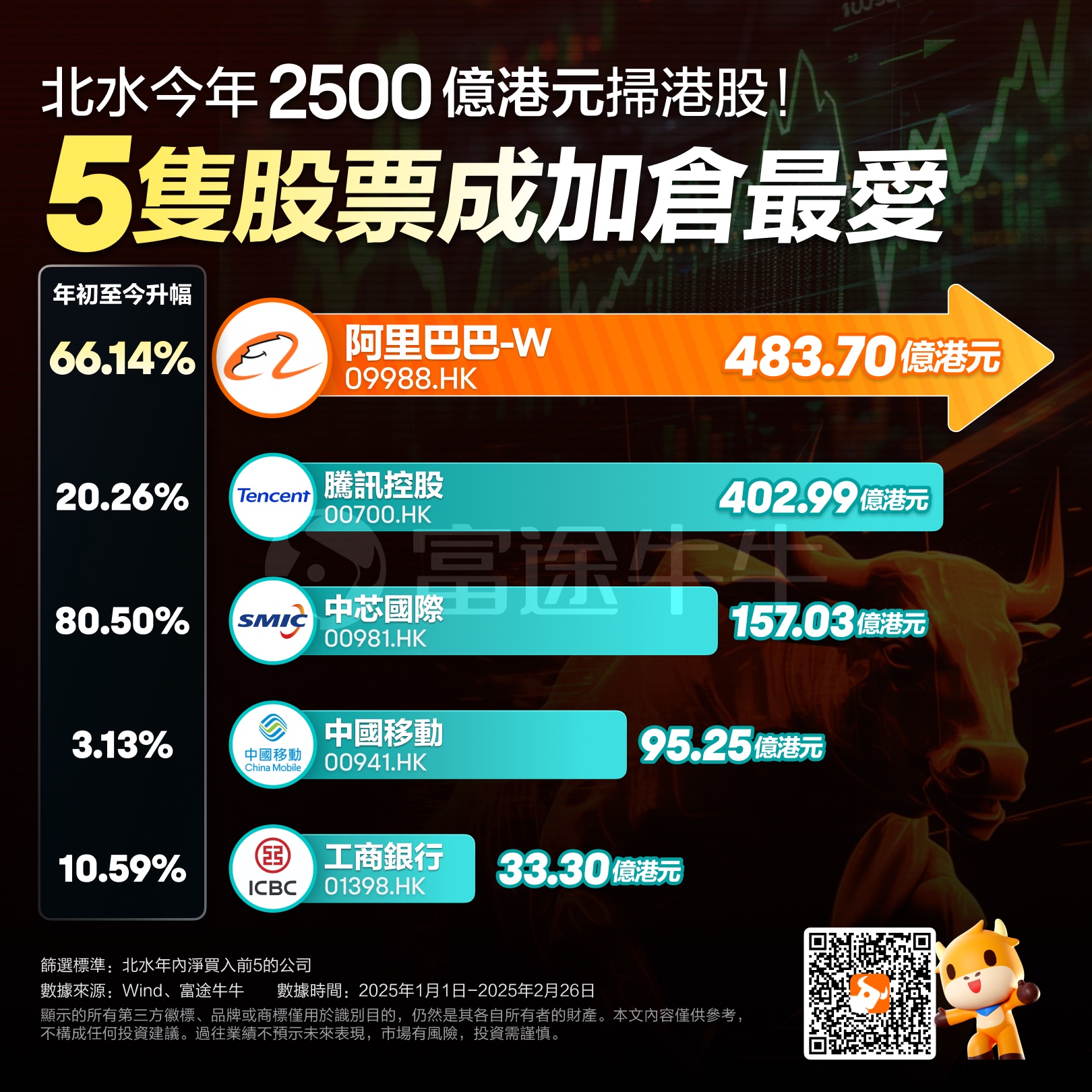 2月26日,南向资金继续大笔流入,带动港股在短暂的一日休整后便重拾涨势,当天恒生科技指数大涨4.47%,全天南向资金净流入104港元,成交额占比46.88%,其中在 $小米集团-W (01810.HK)$ 、$腾讯控股 (00700.HK)$等多个龙头个股上的成交占比已经超50%。