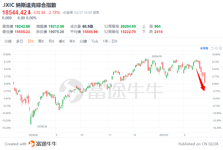 自 $标普500指数 (.SPX.US)$ 在2月19日创下历史新高以来,该指数便开始震荡下滑,近6个交易日已经累计下跌4.6%, $纳斯达克综合指数 (.IXIC.US)$ 更是累计跌7.54%。
