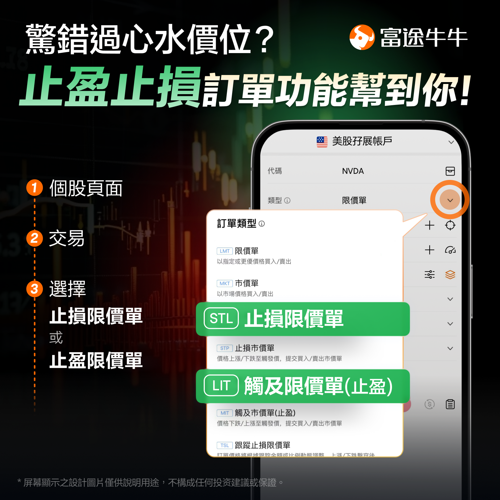 担心买卖错过好价位?富途止盈止损订单帮到你!通过个股页> 交易 > 选择止损限价单或止盈限价单,即可交易!